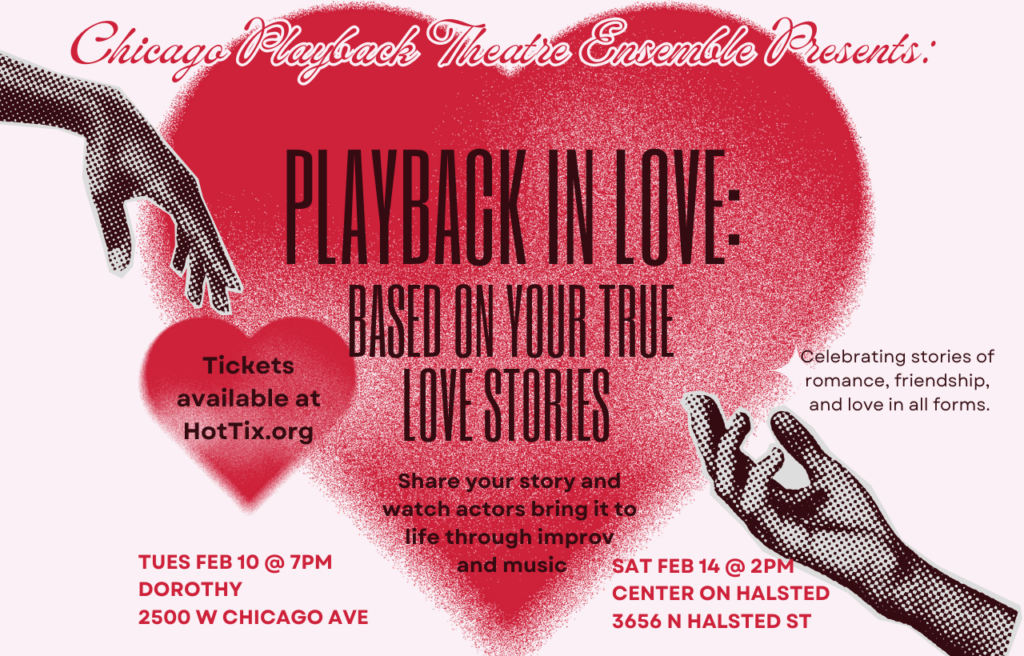 Love is in the air! Share your own unique stories about love in all its many forms through the art of Playback Theatre. From tales of lifelong friendships and marriages spanning decades, to awkward first dates and the beginning sparks of romance, we invite you to share all your stories of love and watch as they are brought to life right in front of your eyes through improv and music. Join us to find community and connection through the stories that are shared.